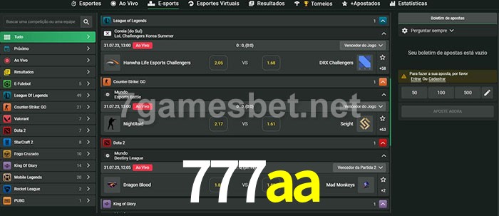 O 777aa oferece uma grande seleção de opções de apostas em e-sports com probabilidades competitivas
